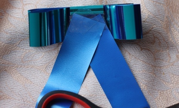 Теперь есть два варианта: прикрепить бант к ленте или завязать бант из длинных концов ленты. Первый вариант не требует пояснений, поэтому рассмотрим второй, а заодно научимся завязывать еще один вид банта.