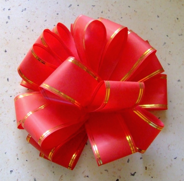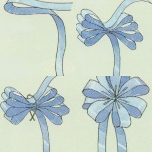 Этот бант стоит вне моды, времени и конкуренции. Оформив подарок таким образом, вы можете быть уверены в том, что бант понравится и женщинам, и мужчинам. Главным условием является то, что лента при завязывании не должна мяться. Все остальное делается согласно схеме.