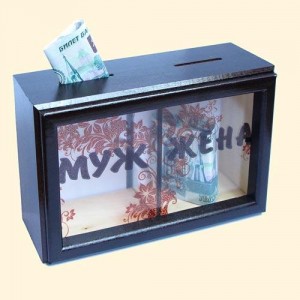 Если ваш подарок предназначается сразу и мужу, и жене, то подарить можно оригинальную копилку, сделанную из любой пластмассовой коробки, разделенной на две части. Не забудьте положить в нее деньги.