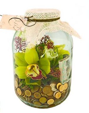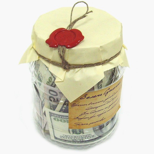 , вот и подарите все сразу: и деньги, и банку. Внутрь банки можно положить цветы, а монеты заменить на шоколадные медальки. Купюры надо оставить настоящие. На этикетке банки можно написать шуточную надпись «Зелень сушеная».