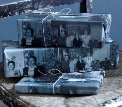 Если ваш подарок предназначается кому-то из родных, то интересным решением будет скопировать фотографии членов семьи на оберточную бумагу и завернуть в нее подарок.