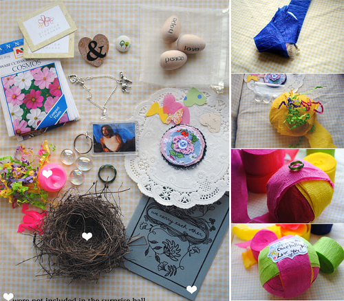 Чтобы сделать такой шар, вам понадобится гофрированная бумага, разрезанная на полоски и, естественно, подарок или несколько маленьких подарков, таких как на фото.