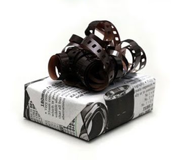 Для фотолюбителя подойдет упаковка с бантом из пленки для фотоаппарата.