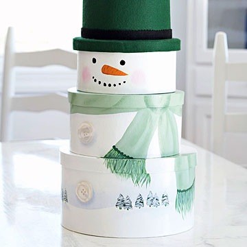 Несколько подарков разного размера красиво упаковать в коробки одной и той же формы, поставить их друг на друга и «слепить» снеговика. Нарисуйте зимний пейзаж, шарф, глаза, нос и рот. Пуговицы можно приклеить настоящие или вырезать их из бумаги. Шляпа – раскрашенная коробка.