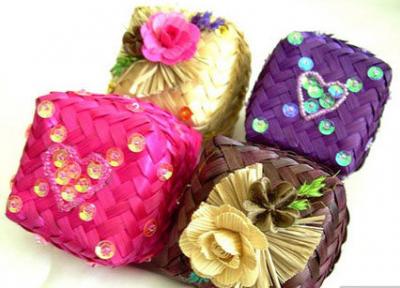 Великолепно смотрятся обычные соломенные коробочки, покрашенные в разные цвета и декорированные бисером, бусами, цветами или тесьмой.