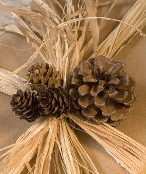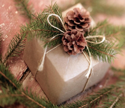 Красиво и оригинально смотрится упаковка с настоящими, натуральными еловыми веточками и шишками.