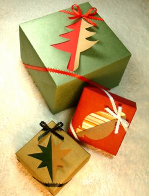 Оригинальное и простое решение: завернуть подарок в два слоя упаковочной бумаги разных цветов. Затем на верхнем слое упаковки надо нарисовать елочку, звездочку или любую другую новогоднюю картинку. После этого вырезать половинку картинки по контуру. Эту половинку отогнуть на другую сторону фигуры.