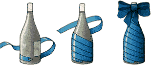 Заверните бутылку в бумагу и изготовьте украшение "гармошка" как показано на рисунке. Для этого возьмите квадратный лист бумаги, сложите его гармошкой и согните пополам, чтобы получилась галочка. Затем украшение вставляют в верхнюю часть бутылки и урепляют клейкой лентой. Также бытылку можно украсить бантом.