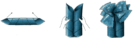 Для изготовления такого банта необходимо подготовить полоски одинаковой длины (10-14см). Затем все полоски делятся на две части, из которых создаются два пучка посредством накладывания полосок друг на друга и перевязывания посередине. Затем два пучка также соединяются посередине и вся конструкция укрепляется на подарке. При желании можно дополнительно украсить цветком или чем-то подобным.