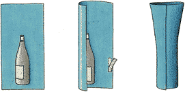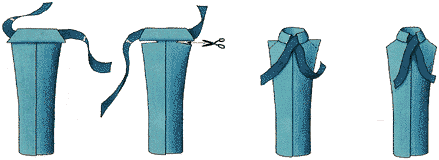 Заверните бутылку в бумагу в соответствии с рисунком. Затем сложите вместе верхние края упаковки и отогните вбок. Подложите под них бант произвольной длины. После подрежьте с краев отогнутую часть. Оставшиеся острые уголки, показанные пунктиром, спрячьте внутрь и заклейте. Придайте верхней части форму воротничка, а бант завяжите галстучком.
