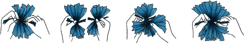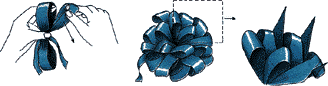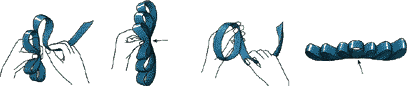 Бант изготавливают из длинной ленты. Постепенно формируют петлю за петлей, каждая последующая чуть длиннее предыдущей. Нижняя часть готова. Верхнюю часть начинают делать с центральной петли и далее аналогично нижней, как показано на рисунке.