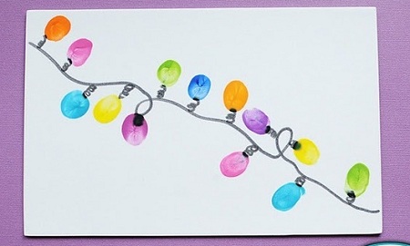 Нарисуйте фломастером «ветку» и крепления для шариков-лампочек. Шарики получатся, если приложить испачканный гуашью палец к нужному месту на открытке. Не хочется пачкать руки в краске? Привлеките к творчеству детей, брата или сестру, пусть они вам помогут.