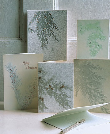 Такая открытка делается за пару минут, если у вас есть высушенная веточка туи. Кроме туи подойдет любой листок или цветок из гербария. Положите веточку на картон и распылите сверху серебряную краску. Уберите растение, и... Открытка готова!