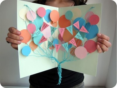 Ко дню рождения обязательно нужна открытка. Вот мы сейчас и сделаем объемную открытку с воздушными шарами.