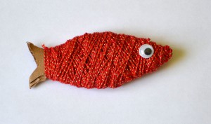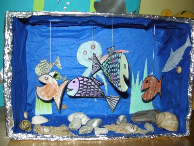 Если вырезать много разных рыбок и обмотать их разными по цвету нитками, то у вас получится целый аквариум, сделанный из обычной крышки от обувной коробки. Не забудьте подвесить рыбок на ниточку и прикрепить ее к верхней части коробки-аквариума. Дно можно украсить ракушками и камушками.
