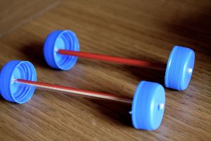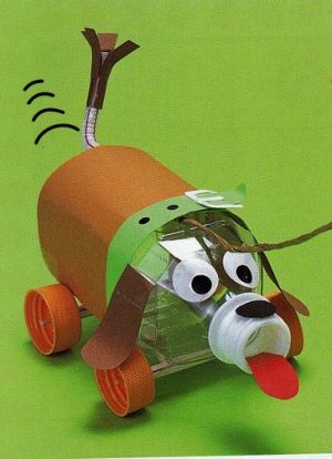 Из одной пластиковой бутылки можно сделать и симпатичную собачку на колесиках и с высунутым языком.