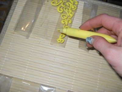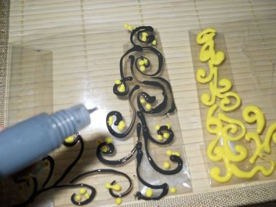 Начинаем украшать органайзер. Рисуем на файлах-кармашках витражным контуром любой узор или рисунок.