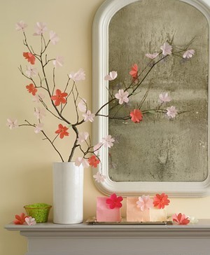 Для того чтобы сделать такую цветущую веточку, надо взять обычные салфетки любого цвета и найти на улице какую-нибудь веточку. Если салфеток в доме не нашлось, то их прекрасно заменит цветная многослойная туалетная бумага. Кроме бумаги, запаситесь ножницами, скотчем или нитками зеленого цвета.