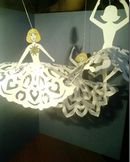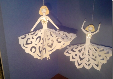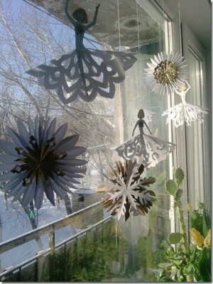 Теперь вырезаем девочек, надеваем на них юбочки-снежинки и подвешиваем на окно, елку или люстру.