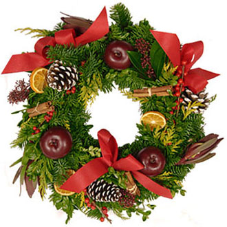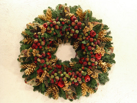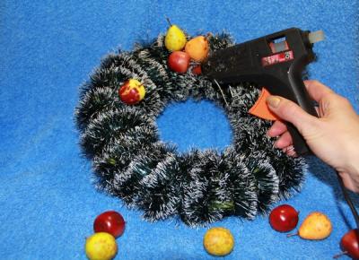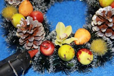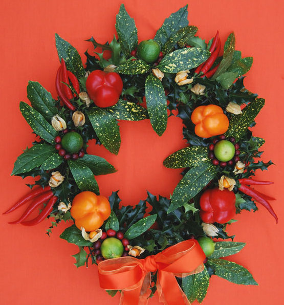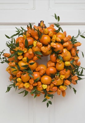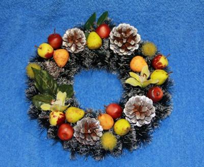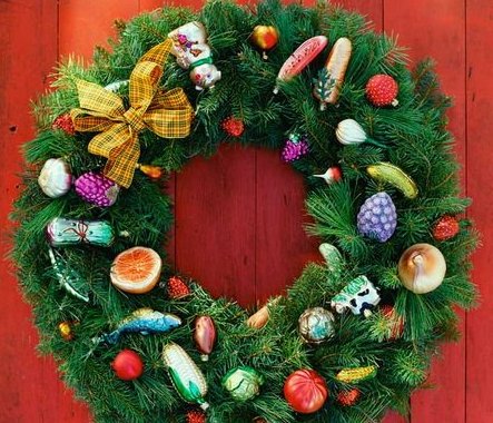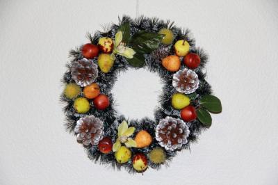 Украсить венок можно всем, что в голову взбредет: игрушками, фруктами, овощами, цветами, шишками, конфетами и даже чесноком, кожурой от апельсинов и лимонными дольками.