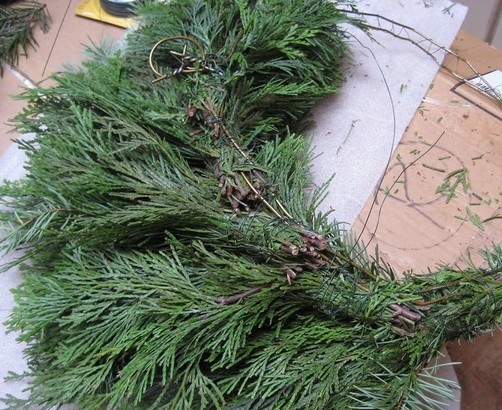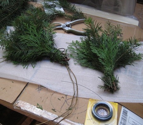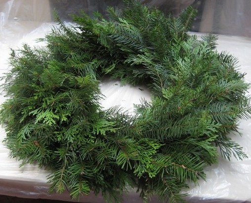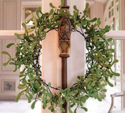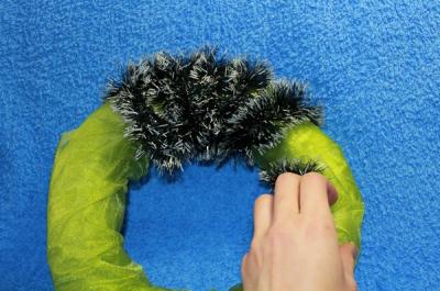 Точно также делается рождественский венок из любой другой искусственной зелени, просто вместо елки берется гирлянда из зеленых веток с листочками.