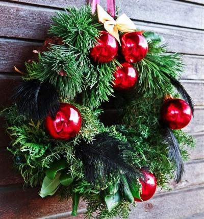 Если кому-то не по душе искусственная зелень, можно сделать венок из настоящей ели или купить готовый, а украсить самому.