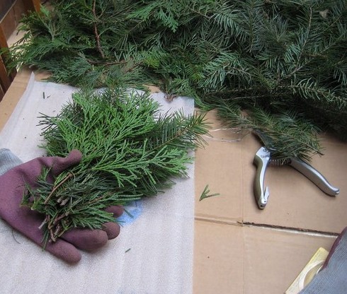 Ветки делают не только из хвои, но и из любой зелени, а также из пуговиц, бантов, бус, помпонов, мотков пряжи и… носовых платков, коробочек и попкорна.