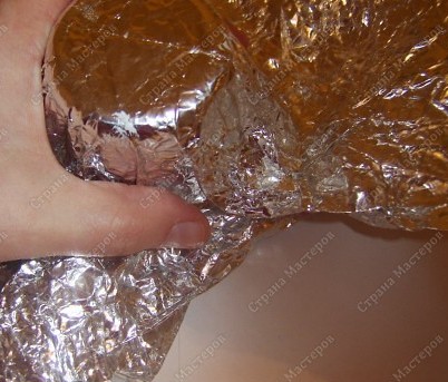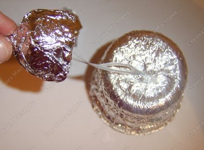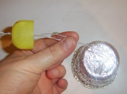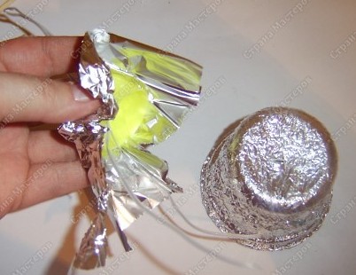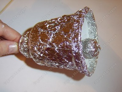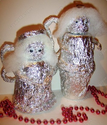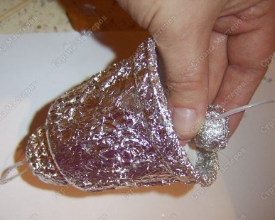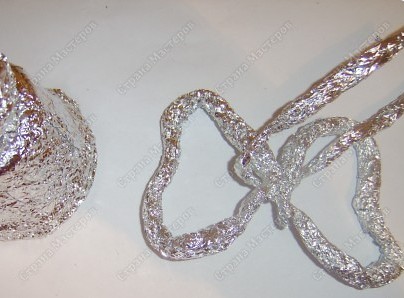 Ангелочки выполняются также как и колокольчики, только для крылышек надо скатать из фольги жгуты, а головой будет большой шарик из скомканной фольги.